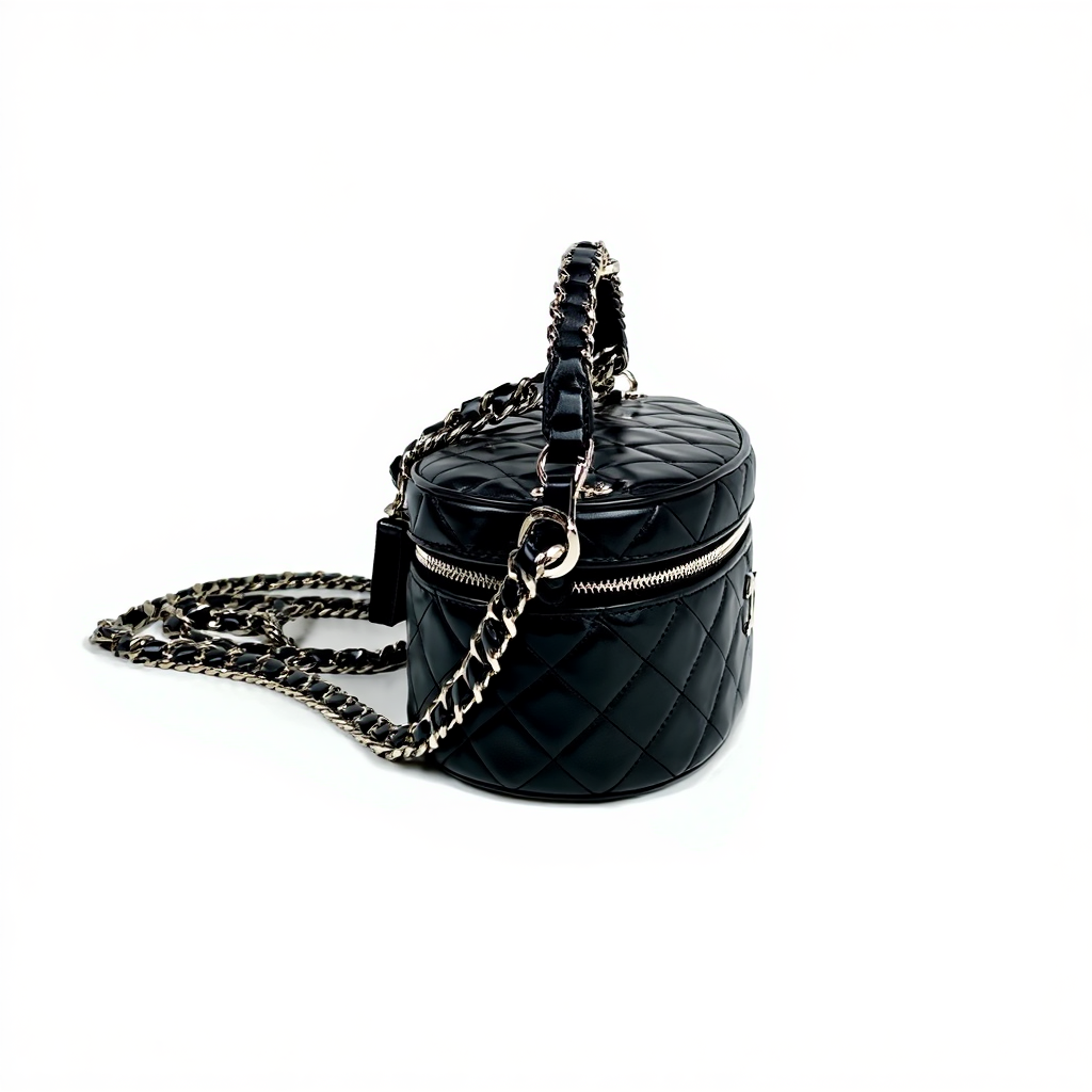 A modern take on Chanel’s timeless vanity silhouette, crafted from luxurious black quilted leather. This piece features the iconic CC logo in gold-tone hardware, a sturdy top handle, and a classic chain-leather strap for crossbody styling. Its structured shape and elegant finish make it a must-have for any Chanel lover.