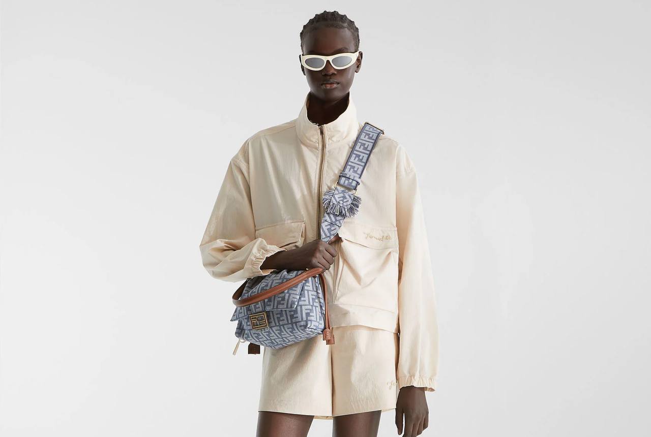 A chic and modern take on Fendi’s iconic aesthetic, this bag features the signature FF monogram in a soft blue jacquard canvas. The relaxed, slightly slouchy silhouette adds an effortless touch, while the brown leather details and gold-tone hardware elevate the look with a luxurious finish.