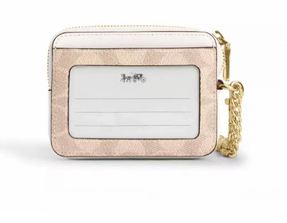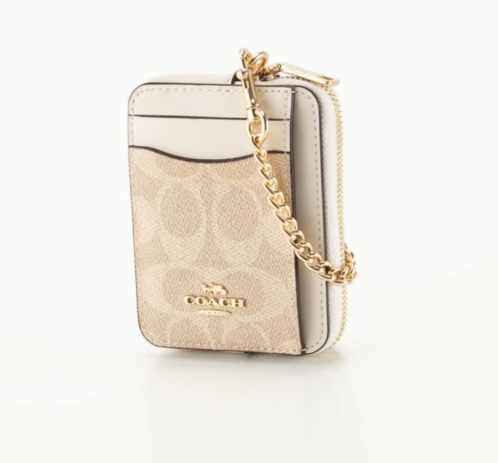 Add a touch of elegance to your everyday essentials with the Coach Signature Mini ID Wallet. Designed in the classic white signature canvas with smooth leather details, this compact piece is perfect for carrying your cards, cash, and small items with effortless style. Featuring a luxurious gold chain, a secure zip-around closure, and an easy-access front card slot, it’s the perfect blend of practicality and chic design. A stylish mini wallet you can toss in any bag—or carry on its own for quick errands.