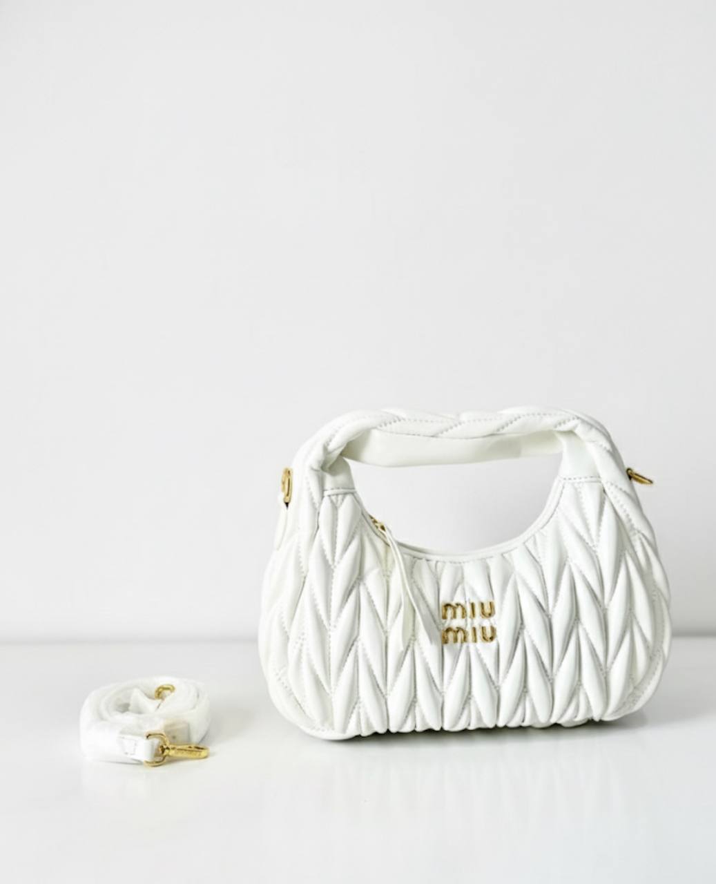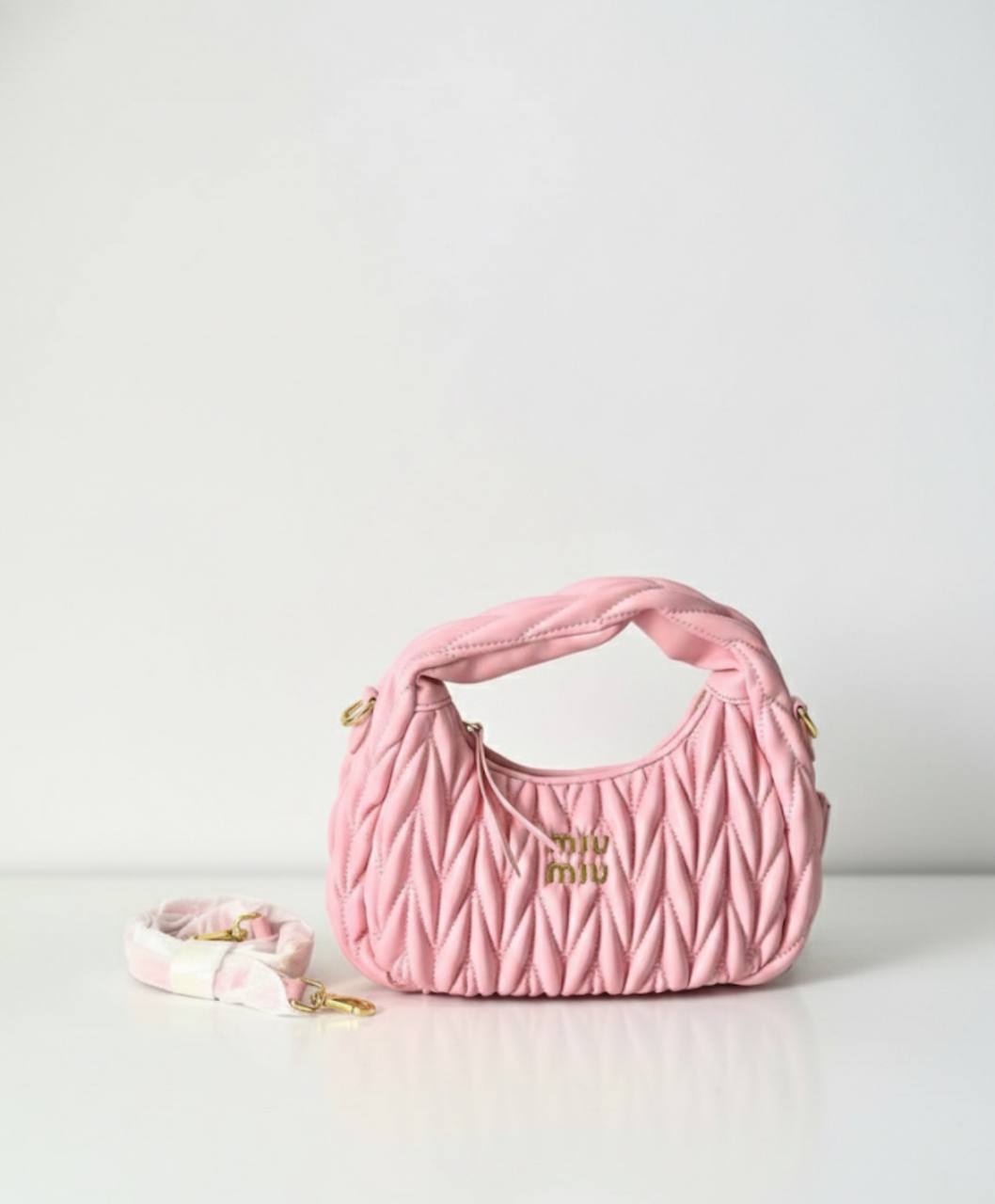 Features: • Material: Soft nappa leather with Miu Miu’s signature matelassé stitching • Color: Baby Pink • Hardware: Gold-tone logo & metal details • Straps: • Padded braided top handle • Detachable and adjustable long strap for shoulder or crossbody wear • Closure: Zip-top closure for secure storage • Interior: Fabric-lined interior with pocket • Design: Curved hobo shape with plush texture and premium finish